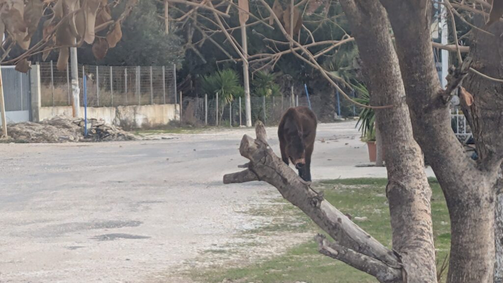 The beach is really Kasey’s place, while Rodney likes the mountains. She was unsettled by this location. As you can see from the picture, many animals are allowed to roam freely, like donkeys. That night, we were treated to cats fighting. Not a lullaby that will wisp you off into dreamland. When morning came, a bird came back to peck at the windows.