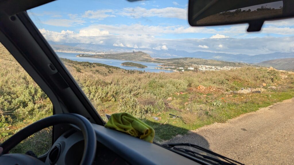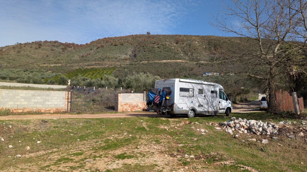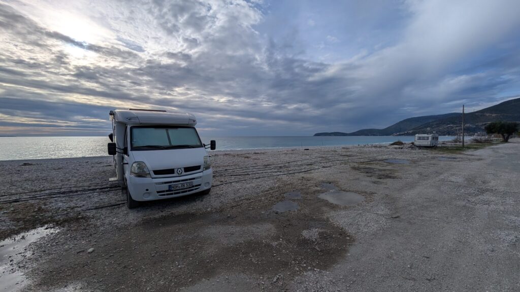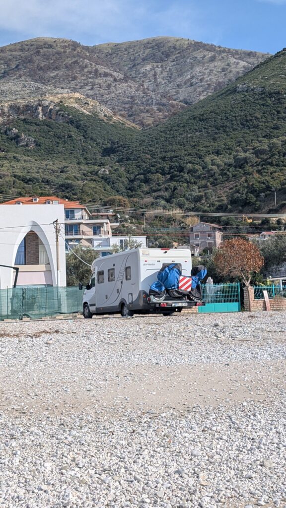 After a couple of nights, we were ready to move on. We headed more south into the town of Ksamil. The grocery we planned to stop at was closed, but their parking lot was available for the one across the street. We got just about all we needed.