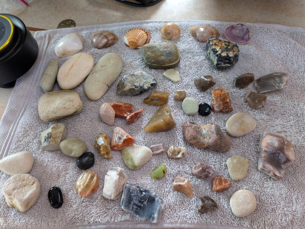 Later I would join them, we would play ball with Salsa, who got a pile of sand on her nose. Kasey noticed some unique gems on the beach, and started collecting them By the time we walked the one length of the beach, and came back, I had a pocketful of rocks. I had to hold up my shorts with my hand.