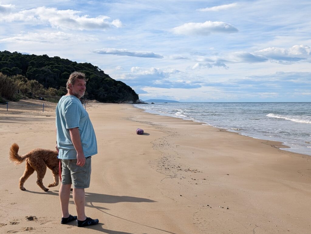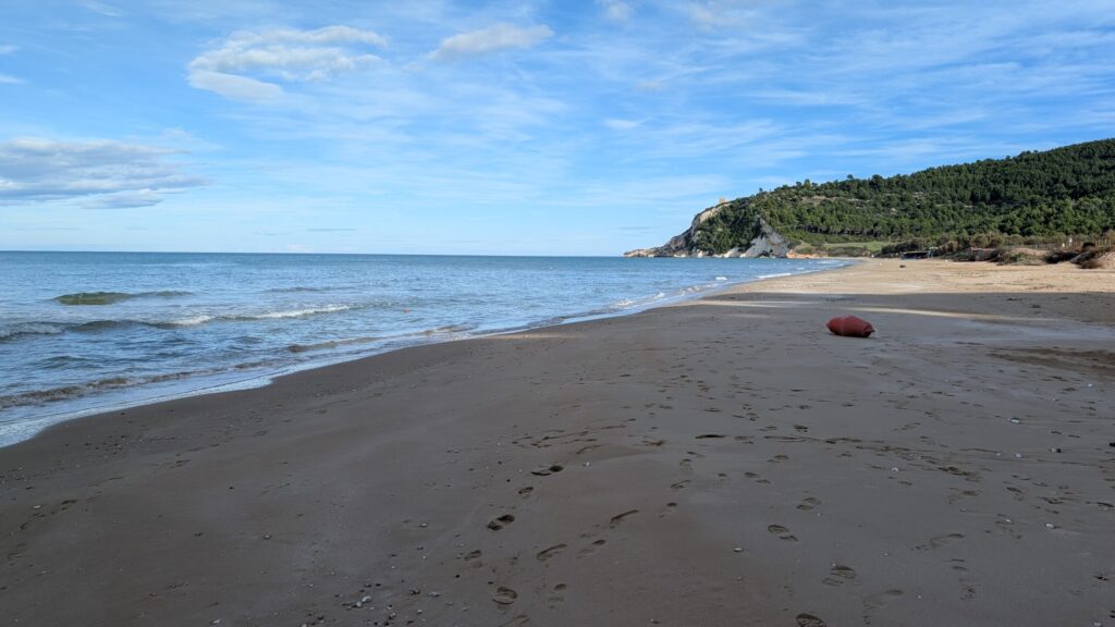 While we had seen the sea while driving, Kasey really wanted some beach time, and we were passing by Gargano National Park, so it seemed like a good detour for her to get her feet wet. It was a winding, sometimes tight, route to get to the national park. We made it down the dirt and gravel road to the entrance. It was off-season, as only two other campers were parked there. We imagined during the peak time, this place was packed.