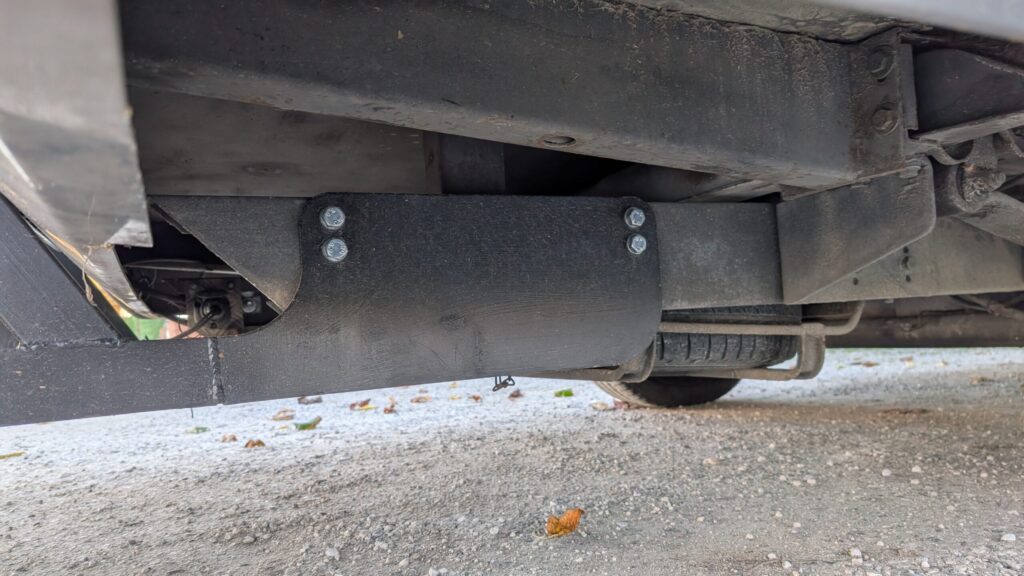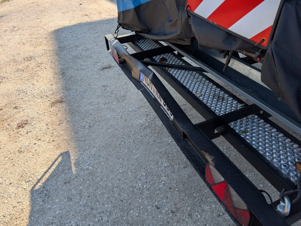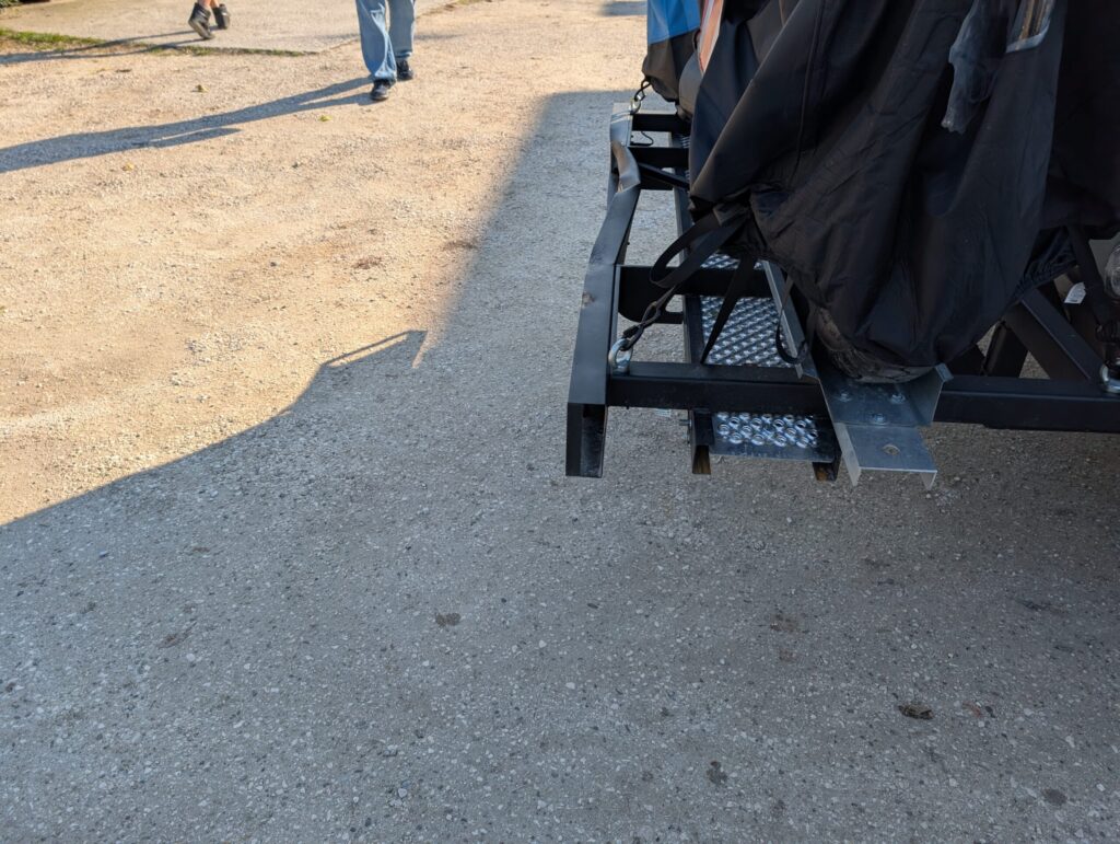 We pulled the camper around to the restaurant entrance, and I went to check out. They had a pretty good lunch crowd. I was told by the waitress that we had left a couple of socks in the dryer. Her daughter had found them in her laundry. She offered to drive up, five minutes, to get them, but I didn’t think she needed to bother. As I got ready to leave, I saw Kasey walking across the parking area, with purpose in her step. Apparently, a lunch patron had backed into the motorcycle rack on the back of the camper. The damage looks much worse than it is, as it damaged the license plate holder, and not any of the structure. We still filled out an accident report.
