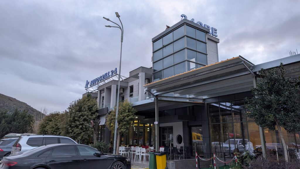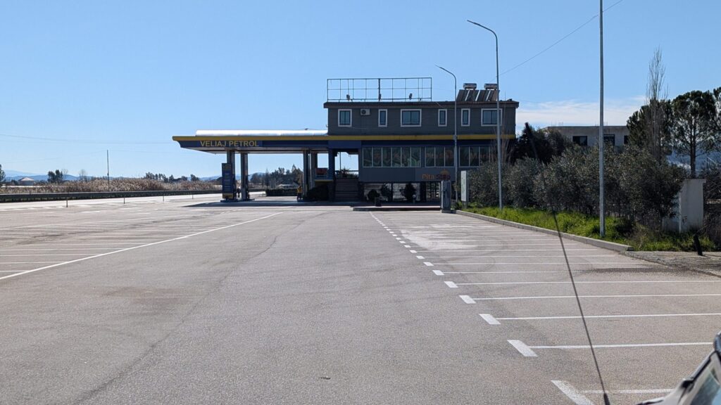 We decided to slow travel and break up the trip over two days. Our first stop was a parking place near the town of Klos. It was a large gas station, rest stop with a restaurant and market. Not many frills here, just a safe place to park and sleep. I did venture to the market, but they didn’t have what I was looking for, mostly snacks for road hungry travelers. They did have a motorcycle with a side car out front on display.