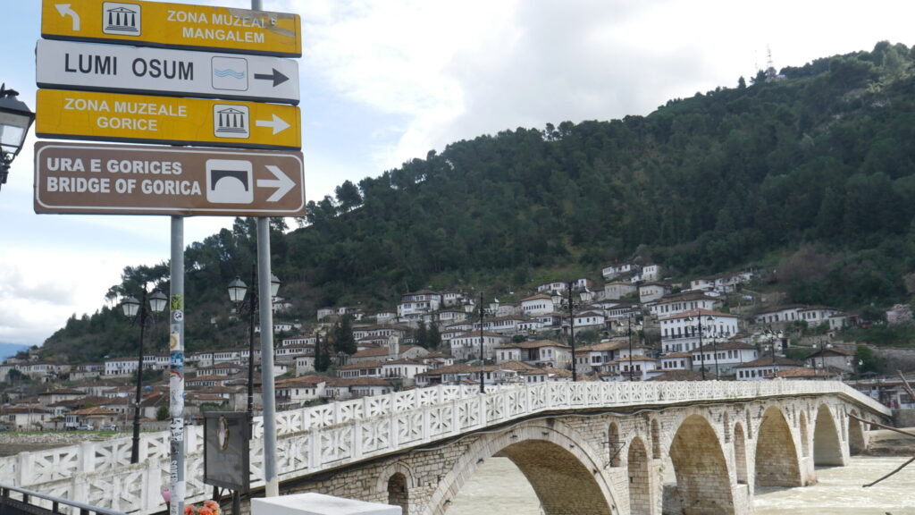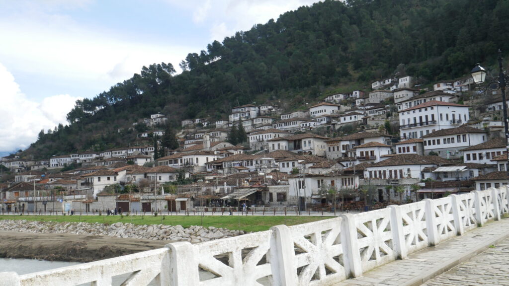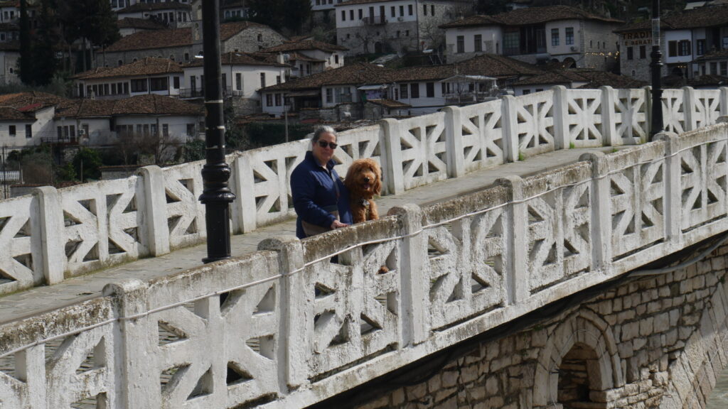 That day came, and we made the short walk to the Gorce Seven Arched Bridge. Originally built of wood in 1780, it was rebuilt using stone in the 1920’s. It crosses the Osum River and connects the Christian and Muslim Quarters of Berat. Multiple religions live in harmony in Albania, something we have been told a number of times, and we have seen it. The area on the other side is also known as the Town of a Thousand Windows. With more rain coming, we we didn’t stop and count.