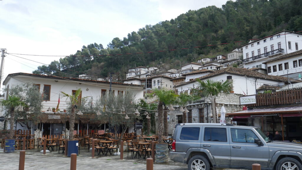 Despite being right off the highway, and we could hear road noise, it settled down quite a bit at night, and we were able to sleep pretty well. After breakfast, we made our way to Berat. As we drew closer to our camp destination, one in the city with a solid concrete parking area, we made our way through a few small towns, and had to stop for geese crossing the road.