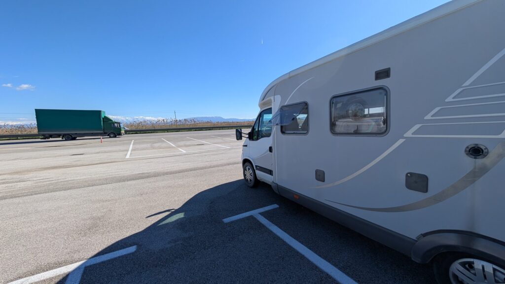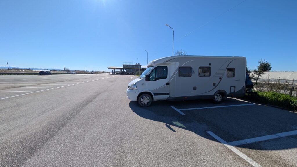 After a peaceful night that we slept pretty well, we woke up, had breakfast, and filled up Holly’s Diesel tank at the station. I also took a couple photos, and added the place to Park4Night, a first for us. We had found our own Park Spot.